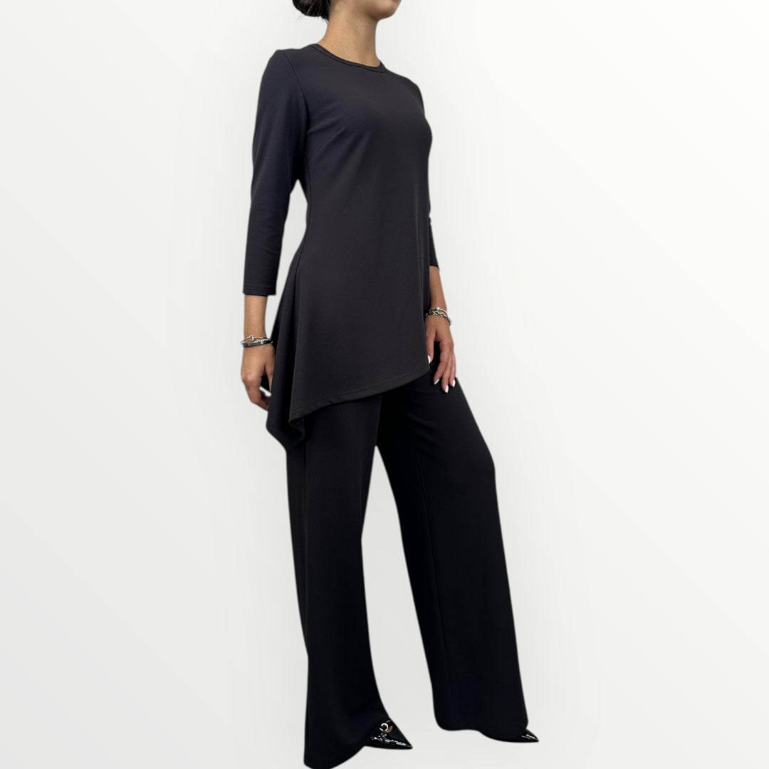 Completo due pezzi con blusa con maniche a 3/4, con fondo asimmetrico. Pantalone morbido a palazzo, con elastico.