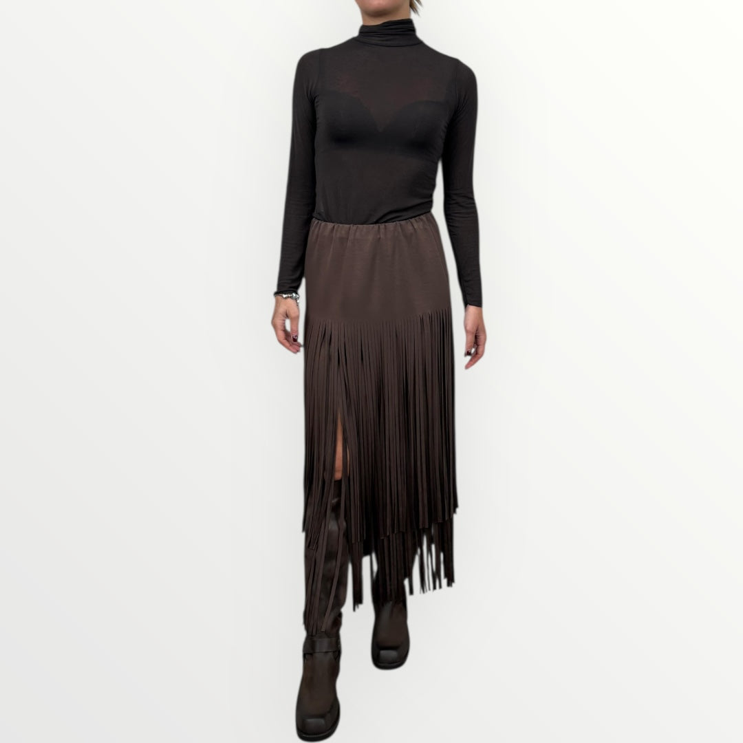 Gonna in jersey con frange poste su due livelli, che partono dal fianco fino alla caviglia. Elastico su tutta la vita.