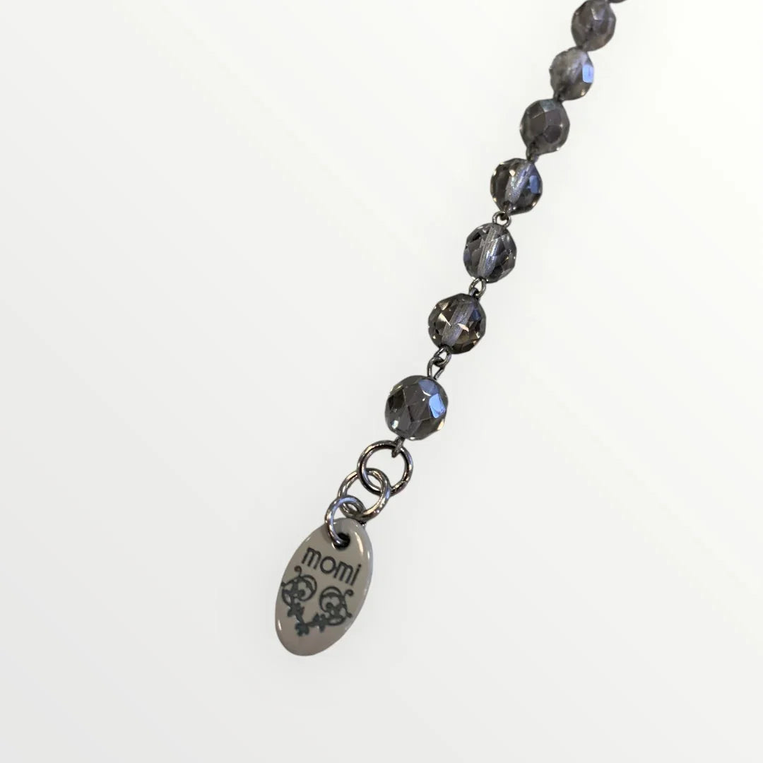 Baguette in materiale leggermente imbottito con manico in catena intrecciata e tracolla lunga rimovibile in catena metallica.